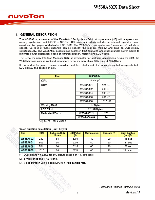 The W538A8xx, a member of the ViewTalkTM family, is an 8-bit microprocessor (uP) with a speech and melody synthesizer and 64SEG x 16 LCD driver unit, which includes an internal regulator, pump circuit and two pages of dedicated LCD RAM.