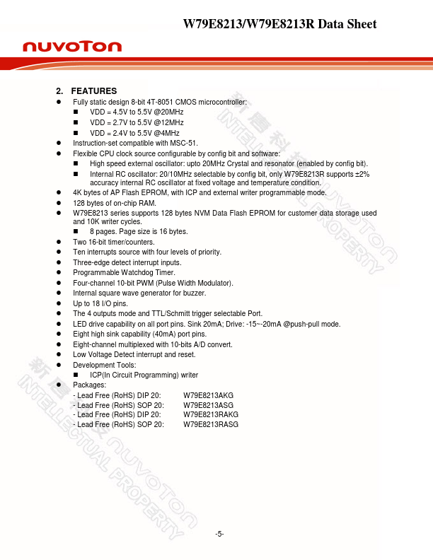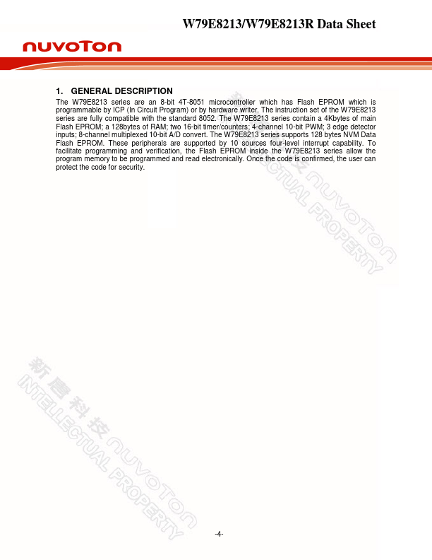 The W79E8213 series are an 8-bit 4T-8051 microcontroller which has Flash EPROM which is programmable by ICP (In Circuit Program) or by hardware writer. The instruction set of the W79E8213 series are fully patible with the standard 8052. The W79E8213 series contain a 4Kbytes of main Flash EPROM;.