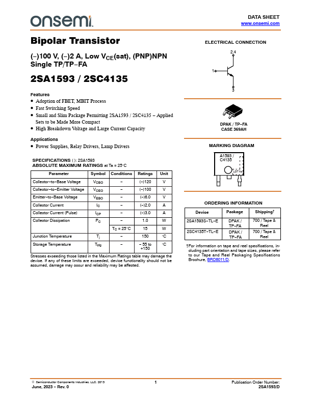 Overview: Bipolar Transistor (−)100 V, (−)2 A, Low VCE(sat), (PNP)NPN Single TP/TP−FA 2SA1593 /.