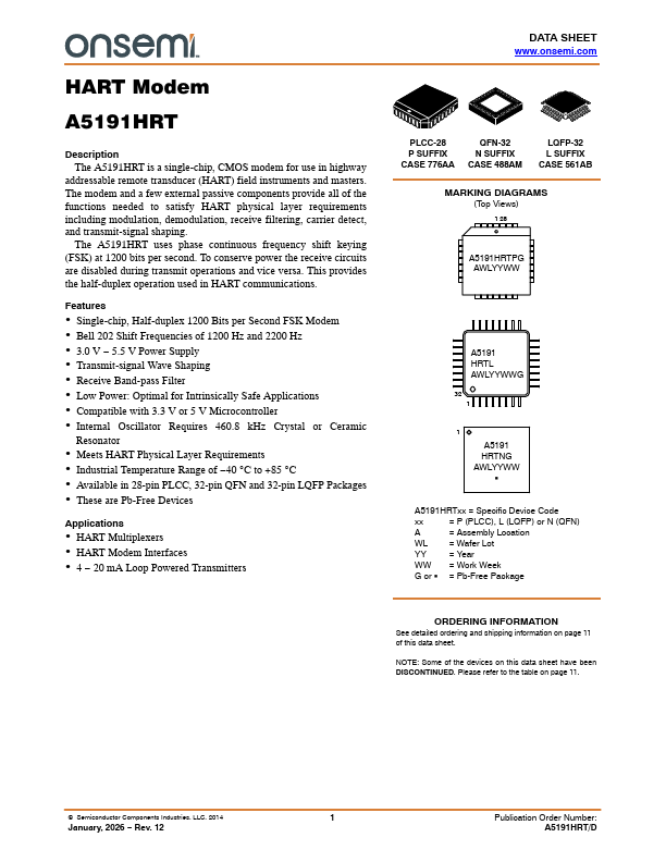The A5191HRT is a single-chip, CMOS modem for use in highway addressable remote transducer (HART) field instruments and masters. The modem and a few external passive ponents provide all of the functions needed to satisfy HART physical layer requirements including modulation, demodulation, receive filtering, carrier detect, and transmit-signal shaping. The A5191HRT uses phase continuous frequency shift keying (FSK)...