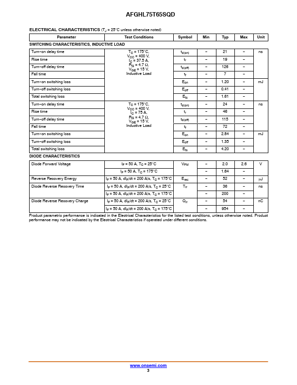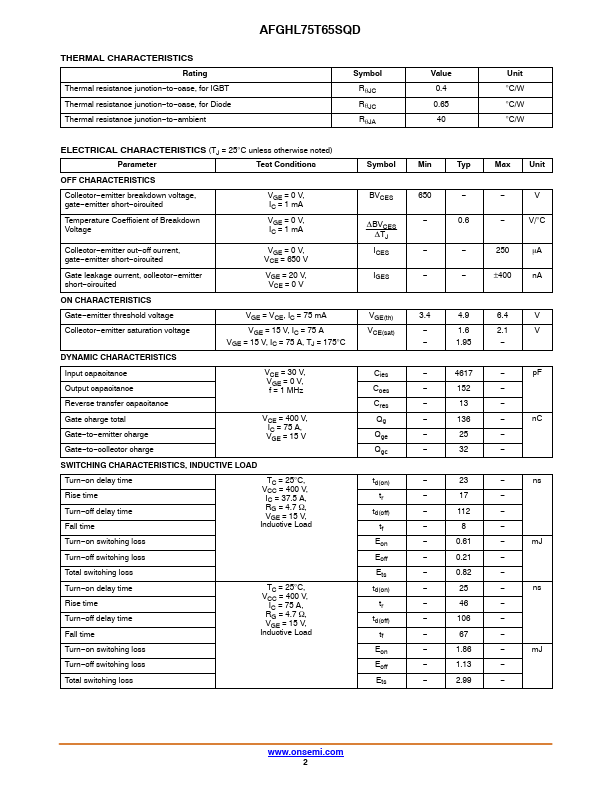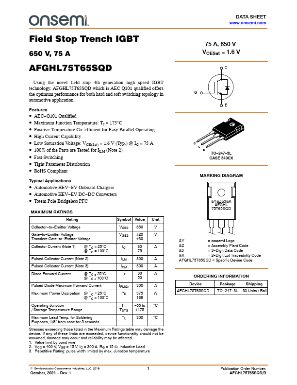 Field Stop Trench IGBT 650 V, 75 A AFGHL75T65SQD Using the novel field stop 4th generation high speed IGBT technology. AFGHL75T65SQD which is AEC Q101 qualified offers the optimum performance for both hard and soft switching topology in automotive application.