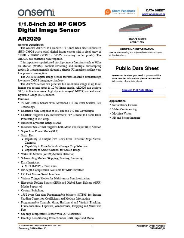 The AR2020 digital image sensor features onsemi’s breakthrough low-noise CMOS imaging technology.