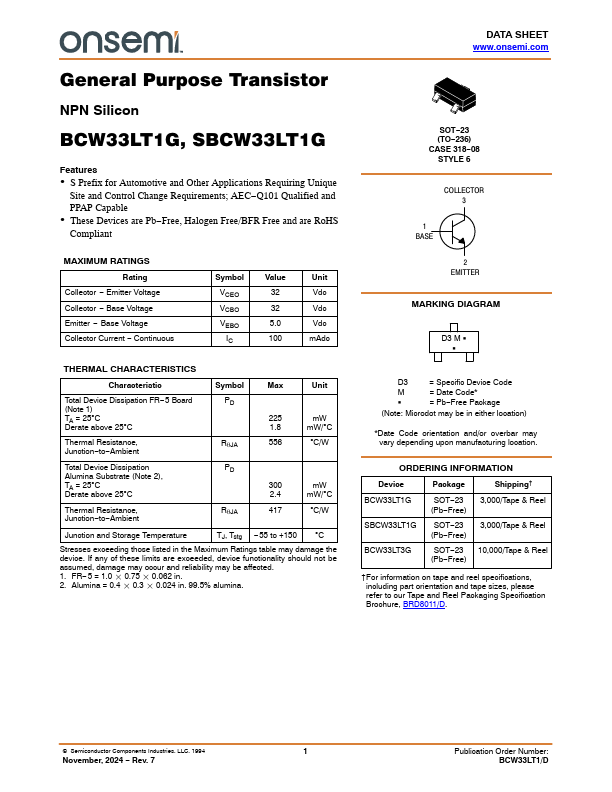 Overview: DATA SHEET .onsemi. General Purpose Transistor NPN Silicon BCW33LT1G,.