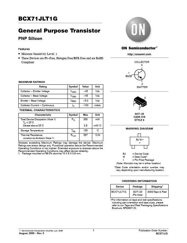 Overview: BCX71JLT1G General Purpose Transistor PNP Silicon.