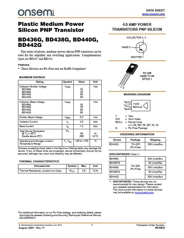 Overview: Plastic Medium Power Silicon PNP Transistor BD436G, BD438G, BD440G, BD442G This series of plastic, medium−power silicon PNP transistors can be used for for amplifier and switching applications. plementary types are BD437 and BD441.