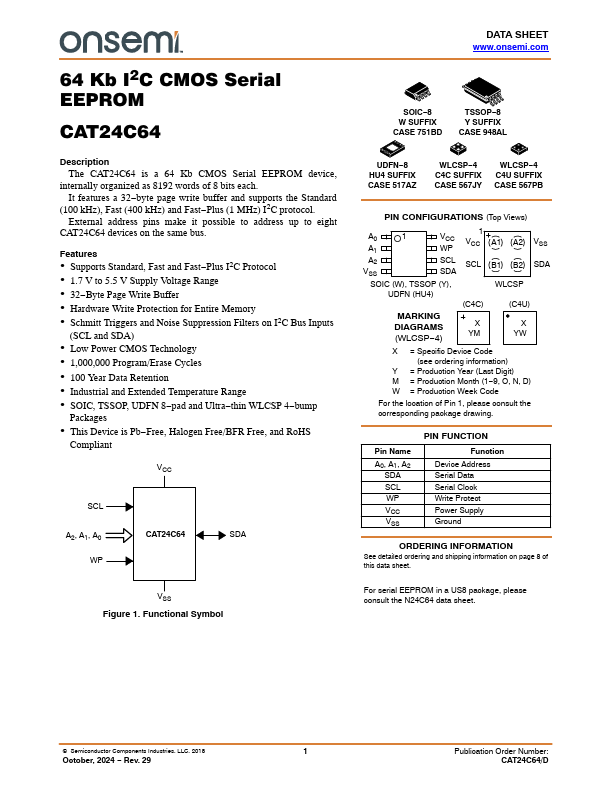 The CAT24C64 is a 64 Kb CMOS Serial EEPROM device, internally organized as 8192 words of 8 bits each.