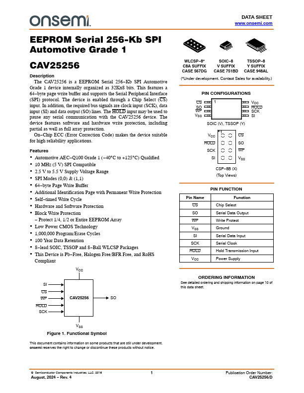 The CAV25256 is a EEPROM Serial 256−Kb SPI Automotive Grade 1 device internally organized as 32Kx8 bits.