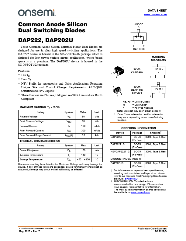mon Anode Silicon Dual Switching Diodes DAP222, DAP202U These mon Anode Silicon Epitaxial Planar Dual Diodes are designed for use in ultra high speed switching applications. The DAP222 device is housed in the SC-75/SOT-416 package which is designed for low power surface mount applications, where board space is at a premium. The DAP202U device is housed in the SC-70/SOT-323 package.