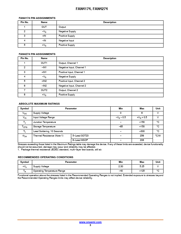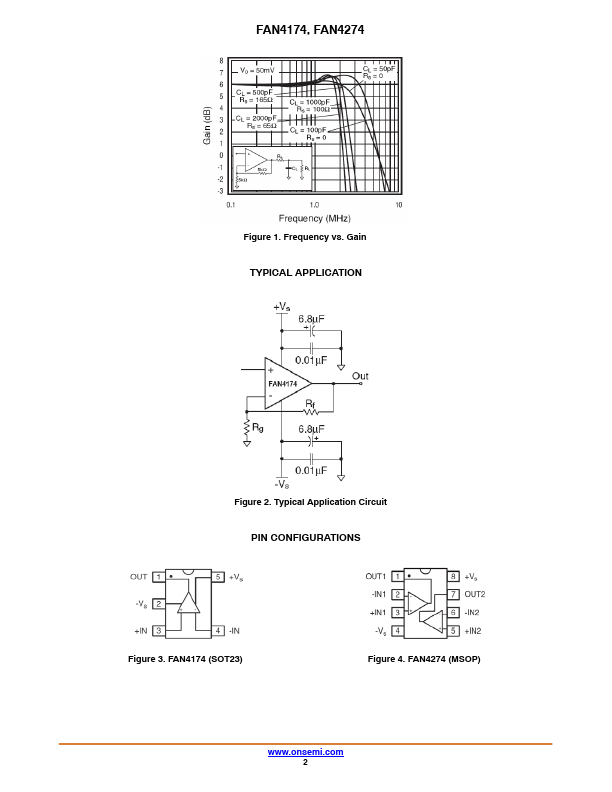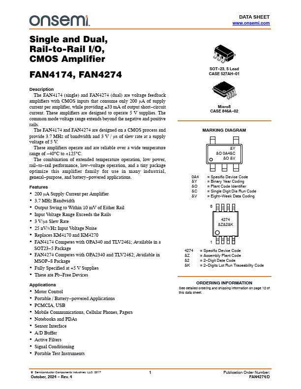 The FAN4174 (single) and FAN4274 (dual) are voltage feedback amplifiers with CMOS inputs that consume only 200 mA of supply current per amplifier, while providing 33 mA of output short−circuit current. These amplifiers are designed to operate 5 V supplies. The mon mode voltage range extends beyond the negative and positive rails.
