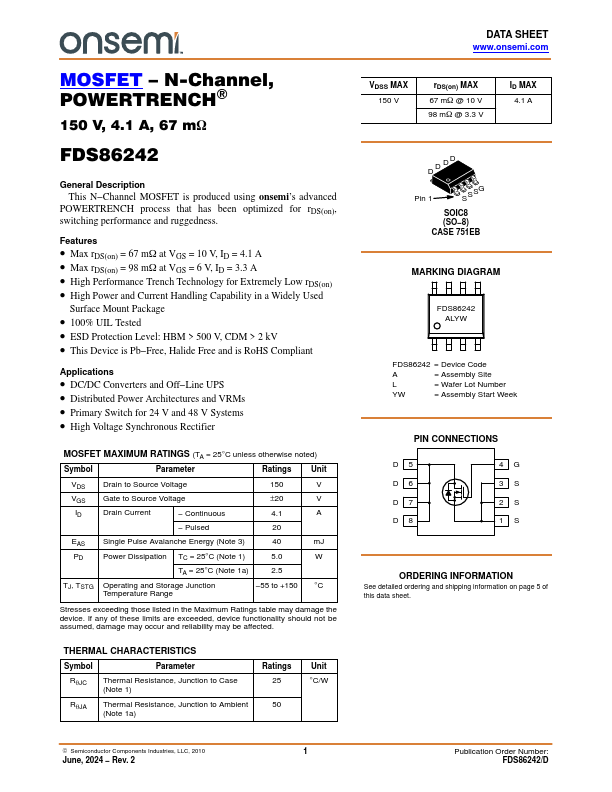 General Description This N−Channel MOSFET is produced using onsemi’s advanced
