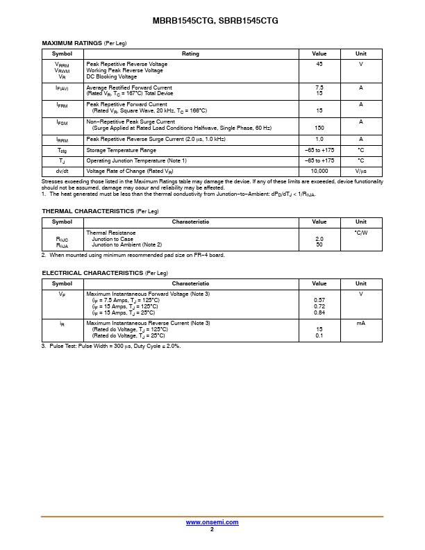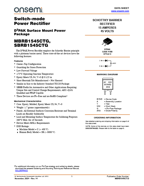 Switch-mode Power Rectifier D2PAK Surface Mount Power Package MBRB1545CTG, SBRB1545CTG The D2PAK Power Rectifier employs the Schottky Barrier principle with a platinum barrier metal. These state-of-the-art devices have the following.