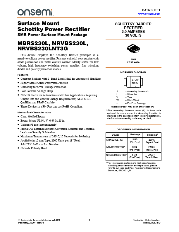 Surface Mount Schottky Power Rectifier SMB Power Surface Mount Package MBRS230L, NRVBS230L, NRVBS230LNT3G This device employs the Schottky Barrier principle in a metal−to−silicon power rectifier.