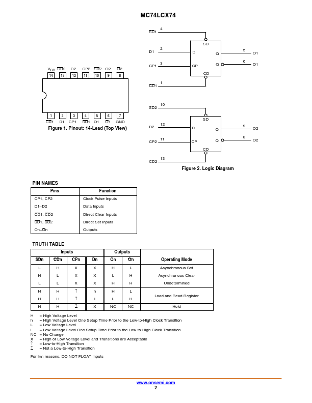 The MC74LCX74 consists of 2 edge-triggered flip-flops with individual D-type inputs. The flip-flop will store the state of individual D inputs, that meet the setup and hold time requirements, on the LOW-to-HIGH Clock (CP) transition.