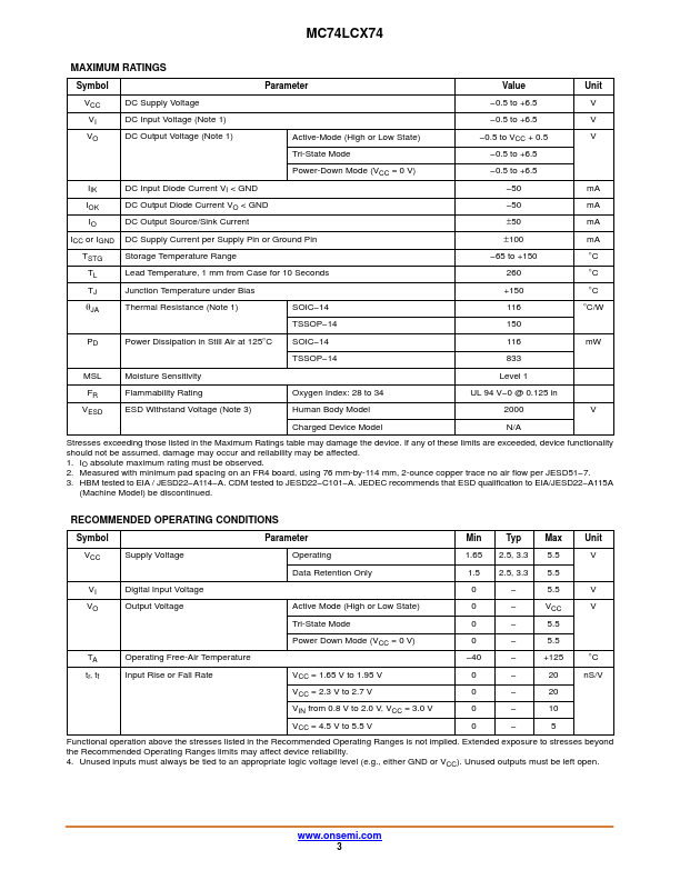 The MC74LCX74 is a high performance, dual D-type flip-flop with asynchronous clear and set inputs and complementary (O, O) outputs. It operates from a 1.65 to 5.5 V supply. High impedance TTL compatible inputs significantly reduce current loading to input drivers while TTL compatible outputs offer improved switching noise performance. A VI specification of 5.5 V allows MC74LCX74 inputs to be safely driven from 5.0 V devices.
