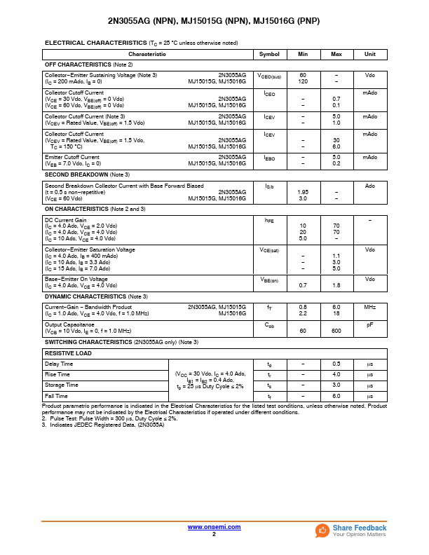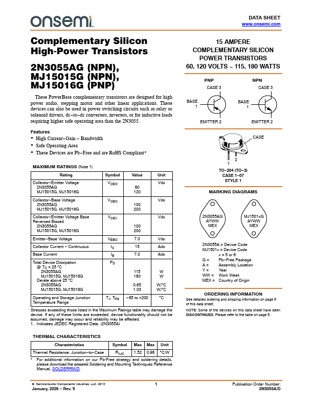 plementary Silicon High-Power Transistors 2N3055AG (NPN), MJ15015G (NPN), MJ15016G (PNP) These PowerBase plementary transistors are designed for high power audio, stepping motor and other linear applications. These devices can also be used in power switching circuits such as relay or solenoid drivers, dc−to−dc converters, inverters, or for inductive loads requiring higher safe operating area than the 2N3055.