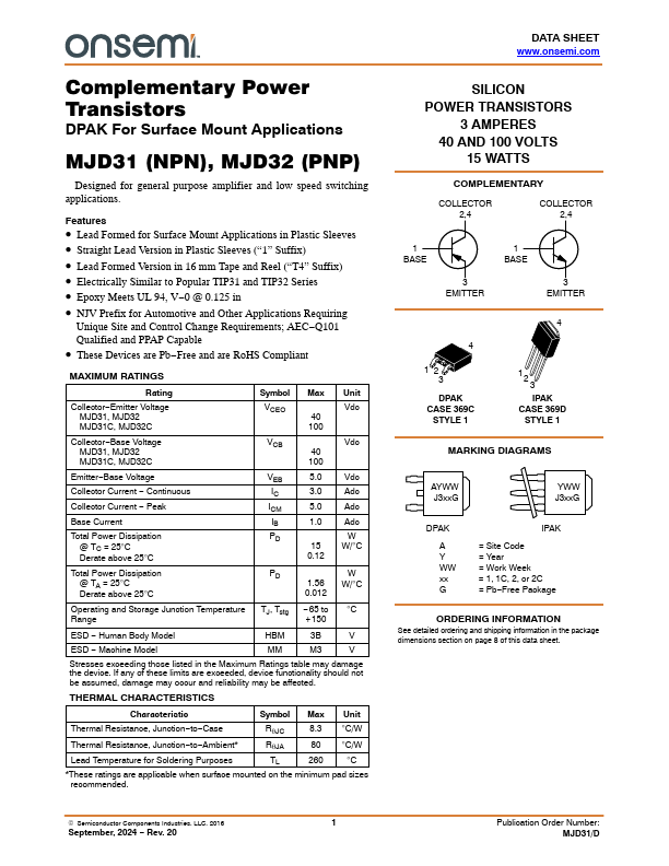Overview: Complementary Power Transistors DPAK For Surface Mount Applications MJD31 (NPN), MJD32 (PNP) Designed for general purpose amplifier and low speed switching applications.