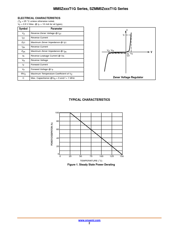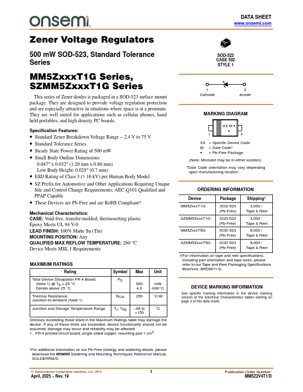 Zener Voltage Regulators 500 mW SOD-523, Standard Tolerance Series MM5ZxxxT1G Series, SZMM5ZxxxT1G Series This series of Zener diodes is packaged in a SOD-523 surface mount package. They are designed to provide voltage regulation protection and are especially attractive in situations where space is at a premium. They are well suited for applications such as cellular phones, hand held portables, and high density PC...