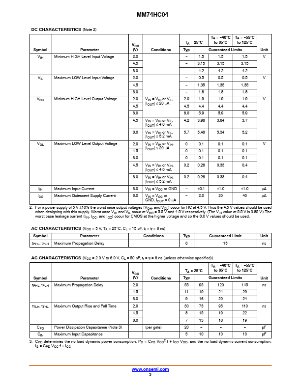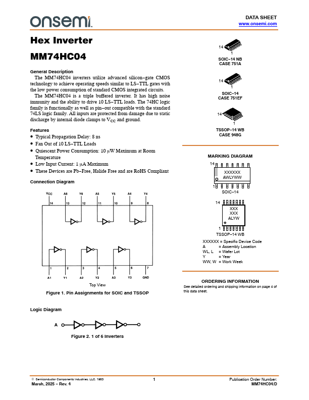 The MM74HC04 inverters utilize advanced silicon−gate CMOS technology to achieve operating speeds similar to LS−TTL gates with the low power consumption of standard CMOS integrated circuits. The MM74HC04 is a triple buffered inverter. It has high noise immunity and the ability to drive 10 LS−TTL loads.