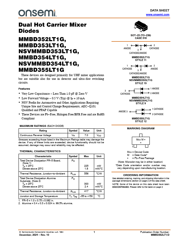 Dual Hot Carrier Mixer Diodes MMBD352LT1G, MMBD353LT1G, NSVMMBD353LT1G, MMBD354LT1G, NSVMMBD354LT1G, MMBD355LT1G These devices are designed primarily for UHF mixer applications but are suitable also for use in detector and ultra−fast switching.