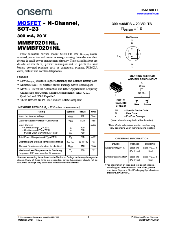 MOSFET - N-Channel, SOT-23 300 mA, 20 V MMBF0201NL, MVMBF0201NL These miniature surface mount MOSFETs low RDS(on) assure minimal power loss and conserve energy, making these devices ideal for use in small power management circuitry. Typical applications are dc−dc converters, power management in portable and battery−powered products such as puters, printers, PCMCIA cards, cellular and cordless telephones.