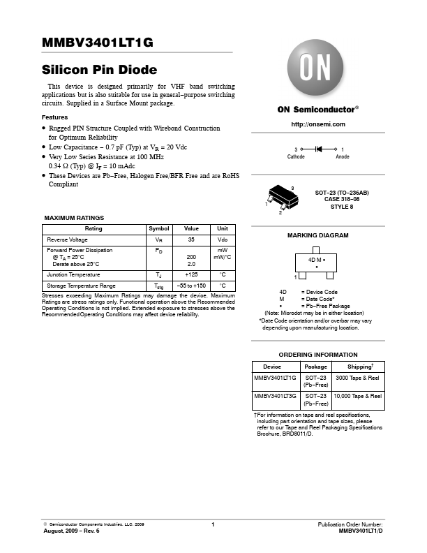 MMBV3401LT1G Silicon Pin Diode This device is designed primarily for VHF band switching applications but is also suitable for use in general−purpose switching circuits. Supplied in a Surface Mount package.