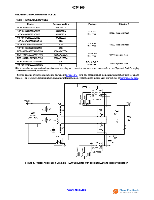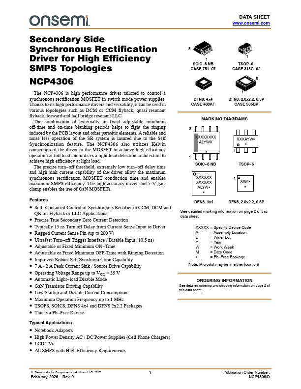 Secondary Side Synchronous Rectification Driver for High Efficiency SMPS Topologies NCP4306 The NCP4306 is high performance driver tailored to control a synchronous rectification MOSFET in switch mode power supplies. Thanks to its high performance drivers and versatility, it can be used in various topologies such as DCM or CCM flyback, quasi resonant flyback, forward and half bridge resonant LLC. The bination of...