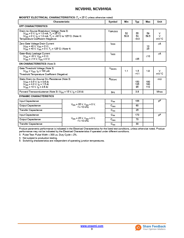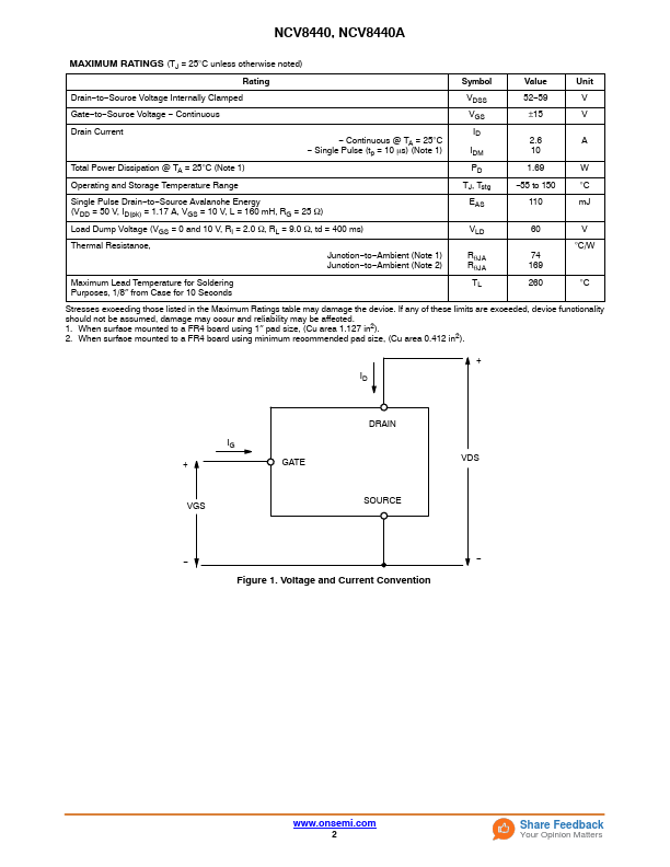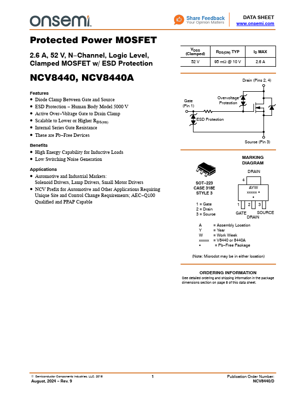 Protected Power MOSFET 2.6 A, 52 V, N−Channel, Logic Level, Clamped MOSFET w/ ESD Protection NCV8440, NCV8440A.