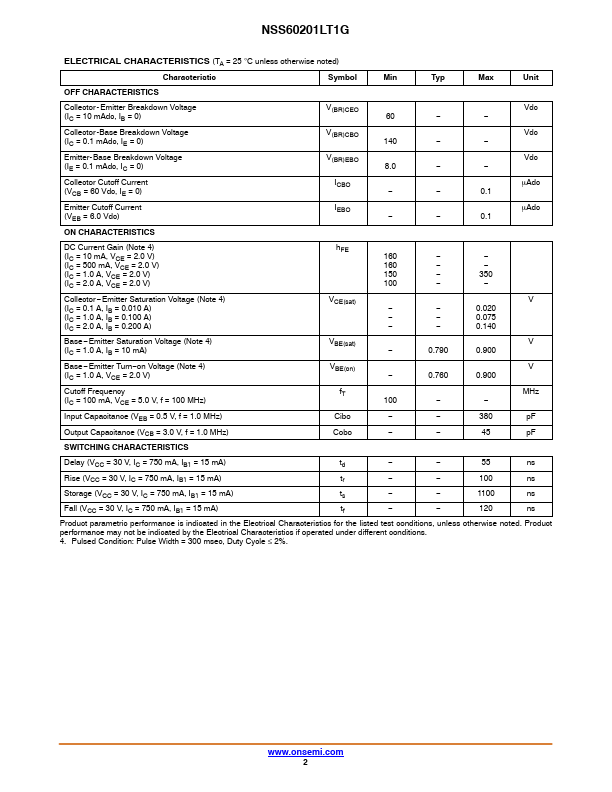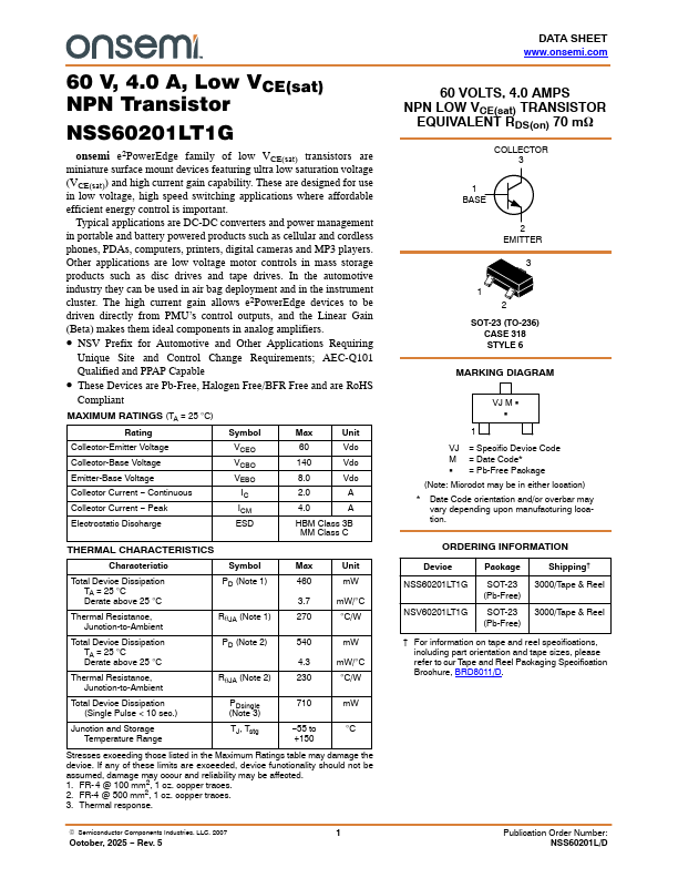 60 V, 4.0 A, Low VCE(sat) NPN Transistor NSS60201LT1G onsemi e2PowerEdge family of low VCE(sat) transistors are miniature surface mount devices featuring ultra low saturation voltage (VCE(sat)) and high current gain capability. These are designed for use in low voltage, high speed switching applications where affordable efficient energy control is important. Typical applications are DC-DC converters and power...