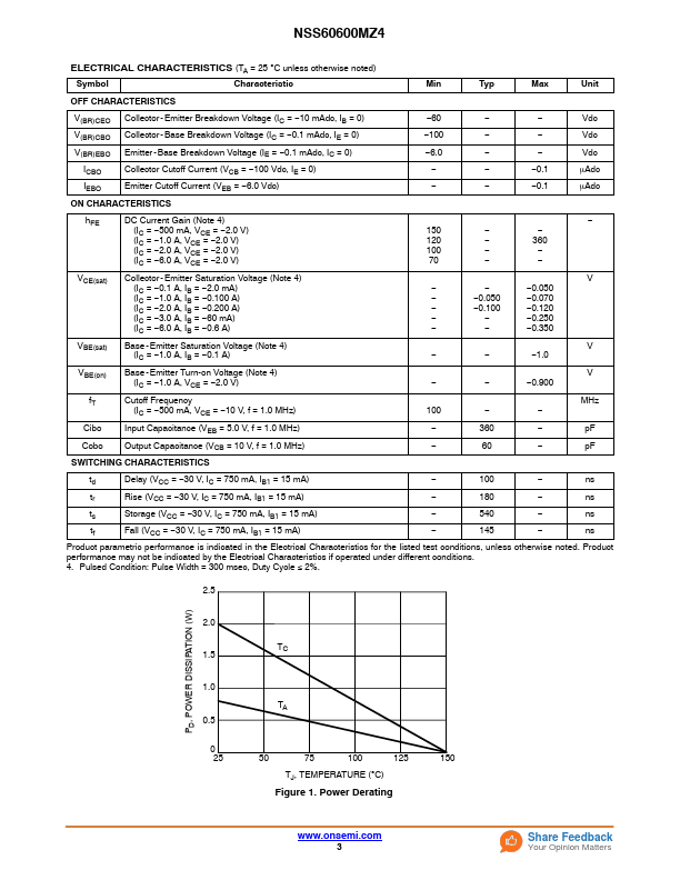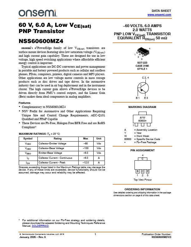 60 V, 6.0 A, Low VCE(sat) PNP Transistor NSS60600MZ4 onsemi’s e2PowerEdge family of low VCE(sat) transistors are surface mount devices featuring ultra low saturation voltage (VCE(sat)) and high current gain capability. These are designed for use in low voltage, high speed switching applications where affordable efficient energy control is important. Typical applications are DC-DC converters and power management in...
