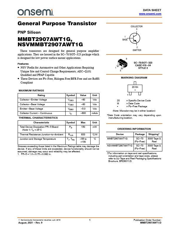 General Purpose Transistor PNP Silicon MMBT2907AWT1G, NSVMMBT2907AWT1G These transistors are designed for general purpose amplifier applications. They are housed in the SC−70/SOT−323 package which is designed for low power surface mount applications.