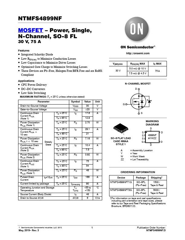 Overview: NTMFS4899NF MOSFET – Power, Single, N-Channel, SO-8 FL 30 V, 75.