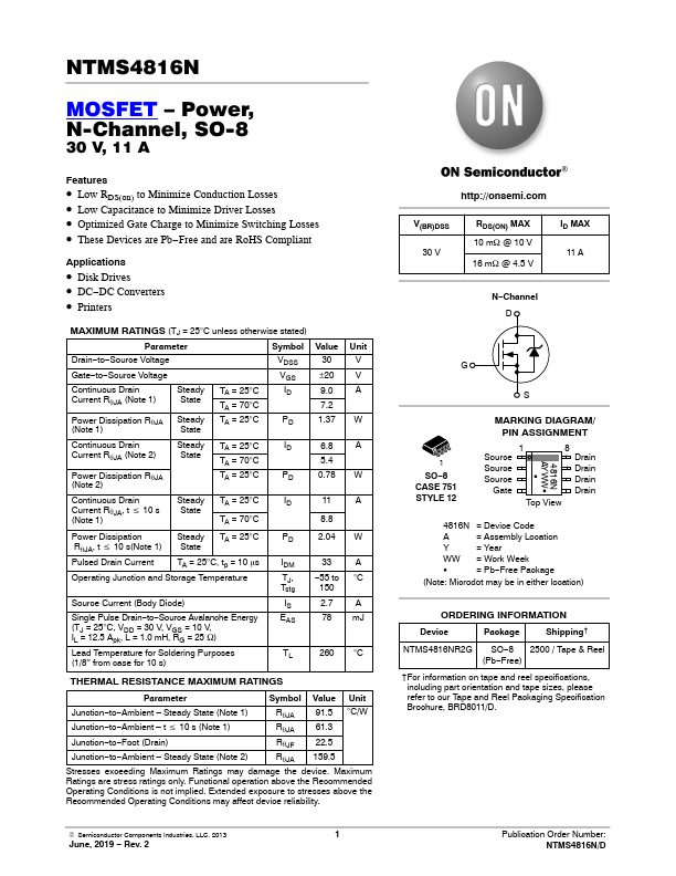 • Low RDS(on) to Minimize Conduction Losses • Low Capacitance to Minimize Driver Losses • Optimized Gate Charge to Minimize Switching Losses • These Devices are Pb−Free and are RoHS Compliant
