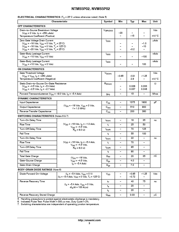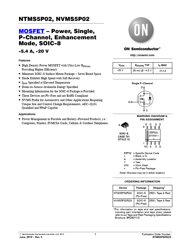 NTMS5P02, NVMS5P02 MOSFET – Power, Single, P-Channel, Enhancement Mode, SOIC-8 -5.
