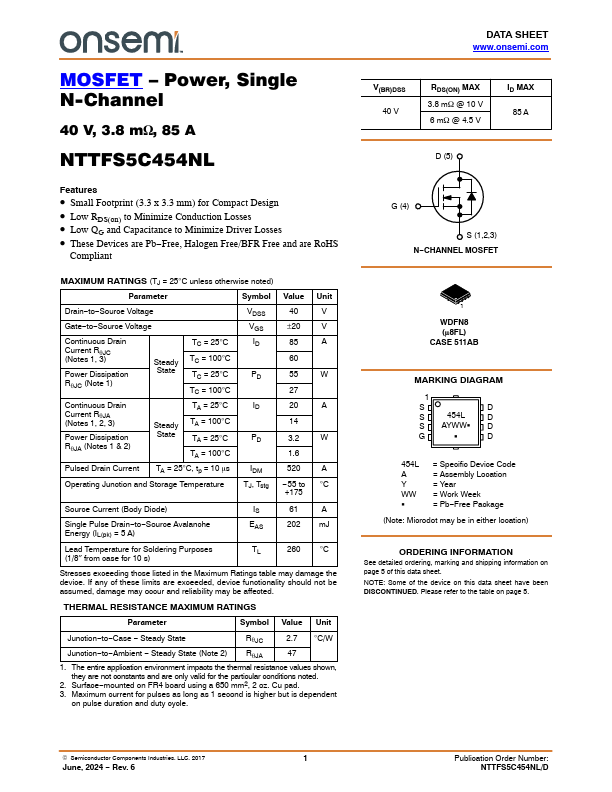 MOSFET Power, Single N-Channel 40 V, 3.8 mW, 85 A NTTFS5C454NL.