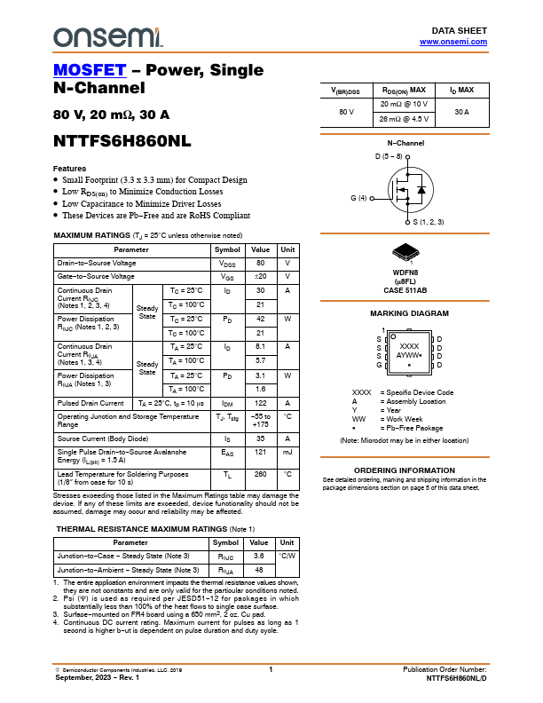 • Small Footprint (3.3 x 3.3 mm) for Compact Design • Low RDS(on) to Minimize Conduction Losses • Low Capacitance to Minimize Driver Losses • These Devices are Pb−Free and are RoHS Compliant