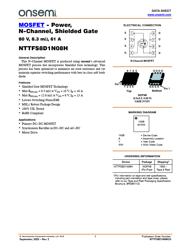 MOSFET process that incorporates Shielded Gate technology. This process has been optimized to minimize on−state resistance and yet maintain superior switching performance with best in class soft body diode.