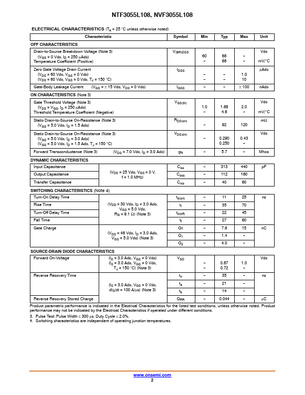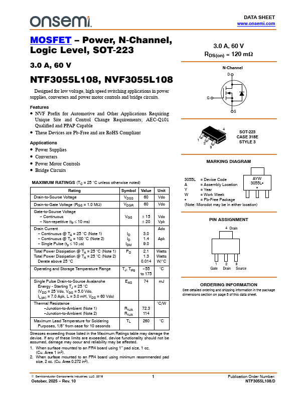 DATA SHEET www.onsemi.com MOSFET – Power, N-Channel, Logic Level, SOT-223 3.0 A, 60 V NTF3055L108, NVF3055L108 Designed for low voltage, high speed switching applications in power supplies, converters and power motor controls and bridge circuits.