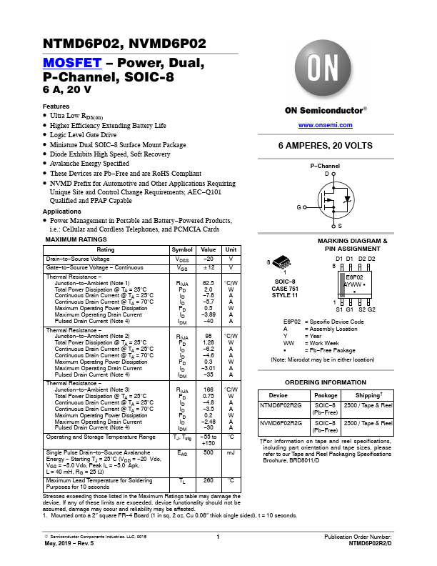 • Ultra Low RDS(on) • Higher Efficiency Extending Battery Life • Logic Level Gate Drive • Miniature Dual SOIC−8 Surface Mount Package • Diode Exhibits High Speed, Soft Recovery • Avalanche Energy Specified • These Devices are Pb−Free and are RoHS Compliant • NVMD Prefix for Automotive and Other Applications Requiring