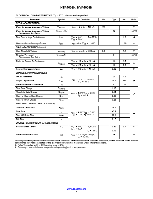 NTR4003N, NVR4003N MOSFET – Single, N-Channel, Small Signal, SOT-23 30 V, 0.