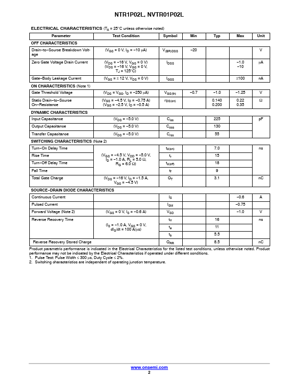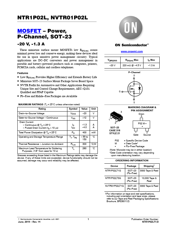 NTR1P02L, NVTR01P02L MOSFET – Power, P-Channel, SOT-23 -20 V, -1.3 A These miniature surface mount MOSFETs low RDS(on) assure minimal power loss and conserve energy, making these devices ideal for use in space sensitive power management circuitry.
