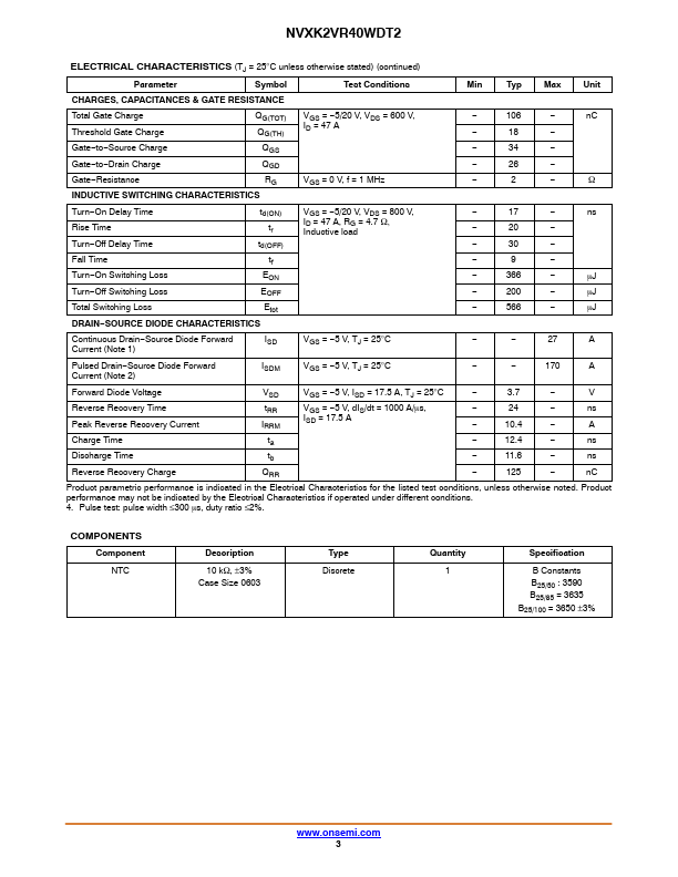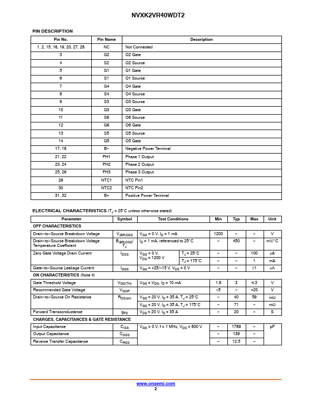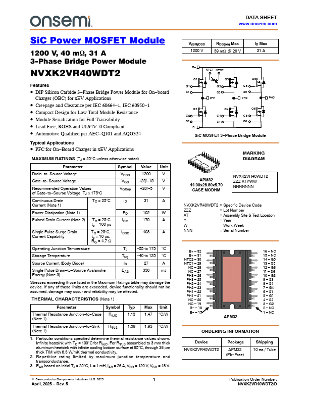 SiC Power MOSFET Module 1200 V, 40 mW, 31 A 3-Phase Bridge Power Module NVXK2VR40WDT2.
