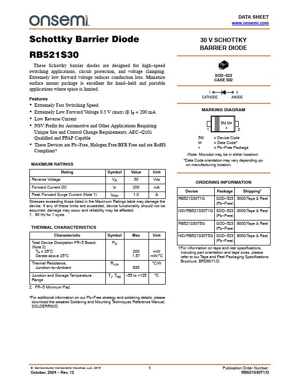 Schottky Barrier Diode RB521S30 These Schottky barrier diodes are designed for high−speed switching applications, circuit protection, and voltage clamping. Extremely low forward voltage reduces conduction loss. Miniature surface mount package is excellent for hand−held and portable applications where space is limited.