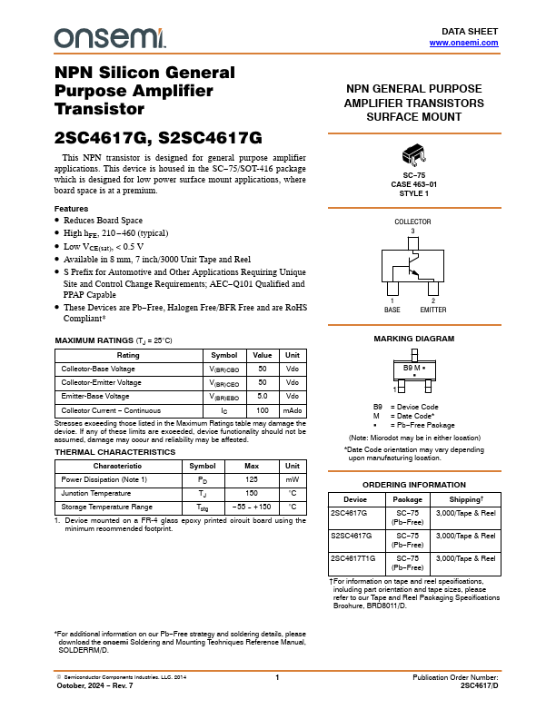 NPN Silicon General Purpose Amplifier Transistor 2SC4617G, S2SC4617G This NPN transistor is designed for general purpose amplifier applications. This device is housed in the SC−75/SOT-416 package which is designed for low power surface mount applications, where board space is at a premium.