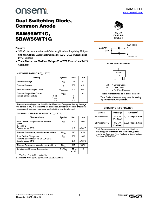 Dual Switching Diode, mon Anode BAW56WT1G, SBAW56WT1G.