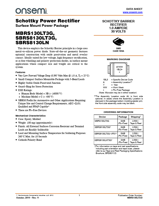Schottky Power Rectifier Surface Mount Power Package MBRS130LT3G, SBRS8130LT3G, SBRS8130LN This device employs the Schottky Barrier principle in a large area metal−to−silicon power diode. State−of−the−art geometry.