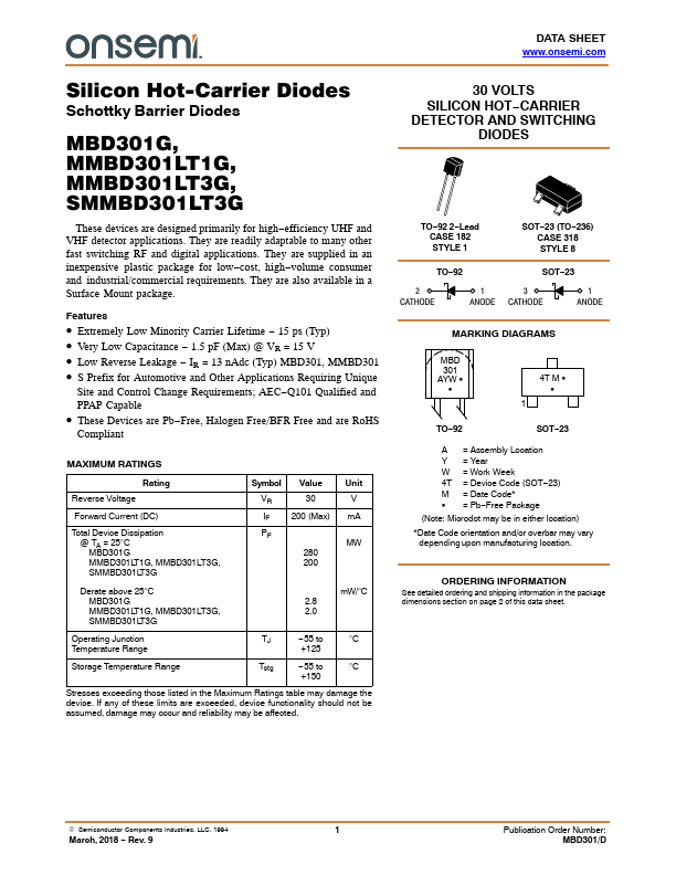 Silicon Hot-Carrier Diodes Schottky Barrier Diodes MBD301G, MMBD301LT1G, MMBD301LT3G, SMMBD301LT3G These devices are designed primarily for high−efficiency UHF and VHF detector applications. They are readily adaptable to many other fast switching RF and digital applications. They are supplied in an inexpensive plastic package for low−cost, high−volume consumer and industrial/mercial requirements.