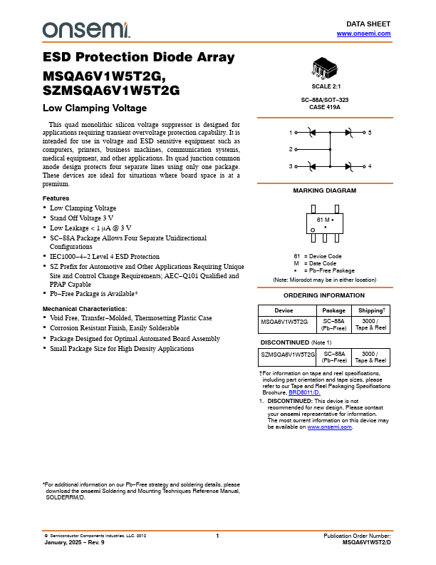 ESD Protection Diode Array MSQA6V1W5T2G, SZMSQA6V1W5T2G Low Clamping Voltage This quad monolithic silicon voltage suppressor is designed for applications requiring transient overvoltage protection capability. It is intended for use in voltage and ESD sensitive equipment such as puters, printers, business machines, munication systems, medical equipment, and other applications. Its quad junction mon anode design...