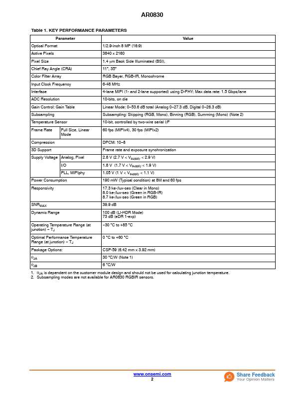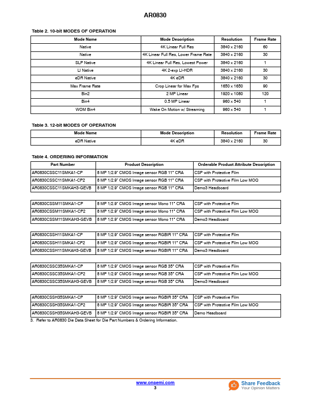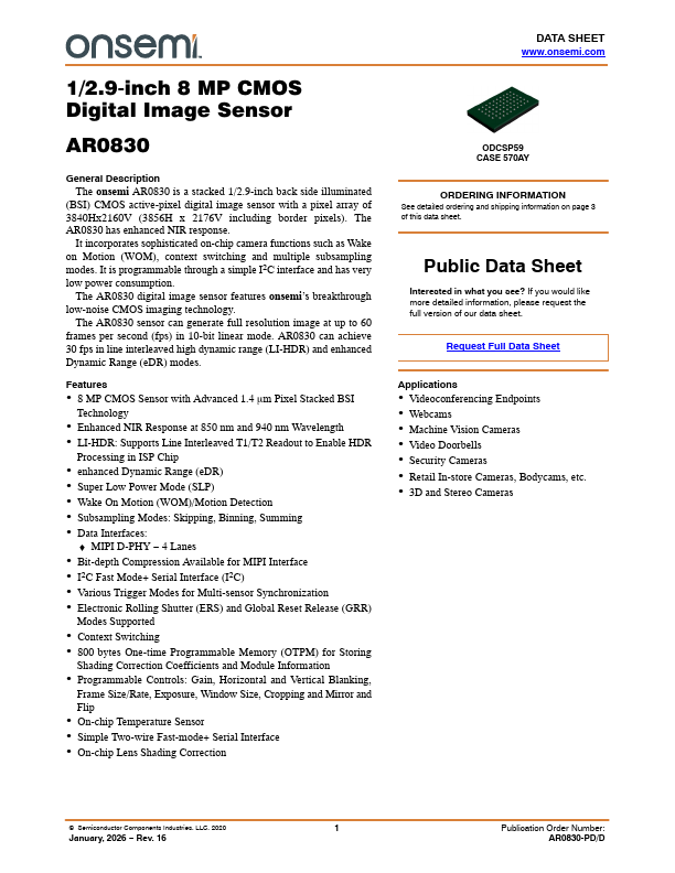 The onsemi AR0830 is a stacked 1/2.9-inch back side illuminated (BSI) CMOS active-pixel digital image sensor with a pixel array of 3840Hx2160V (3856H x 2176V including border pixels). The AR0830 has enhanced NIR response. It incorporates sophisticated on-chip camera functions such as Wake on Motion (WOM), context switching and multiple subsampling modes.