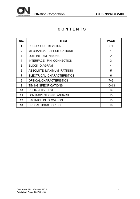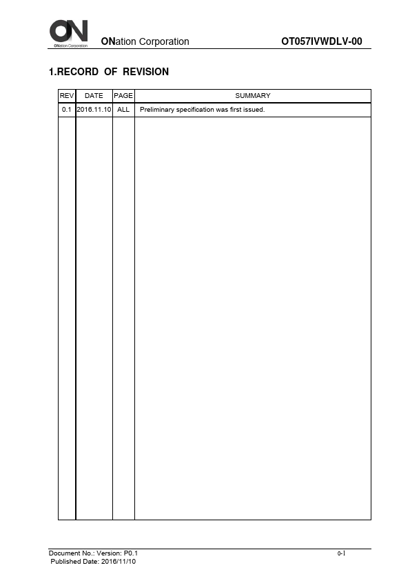 ONation Corporation TFT COLOR LCD MODULE MODEL: OT057IVWDLV-00 (plied with RoHS) VGA LVDS interface (1port) Version: 1 APPROVAL ONATION CHECKER PREPARE All information is subject to change without notice.