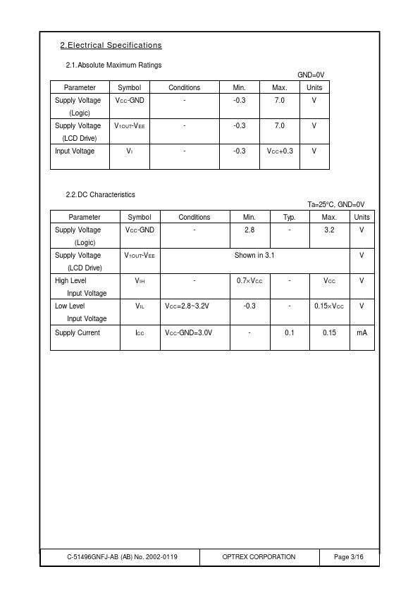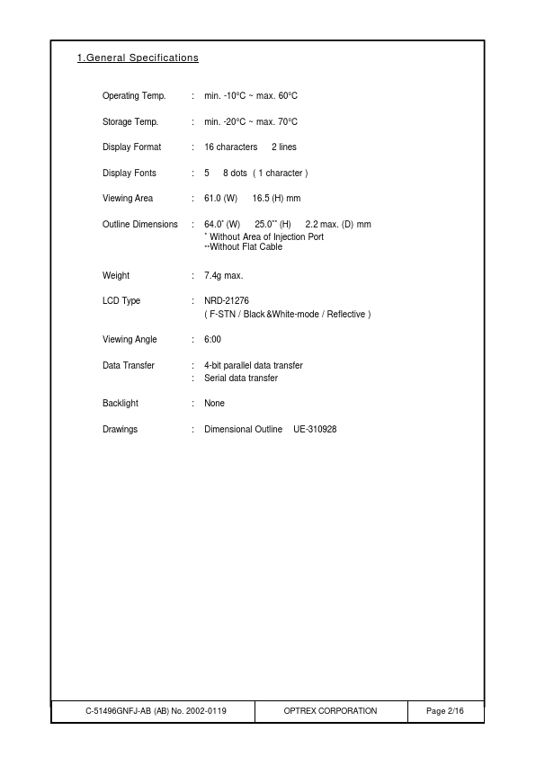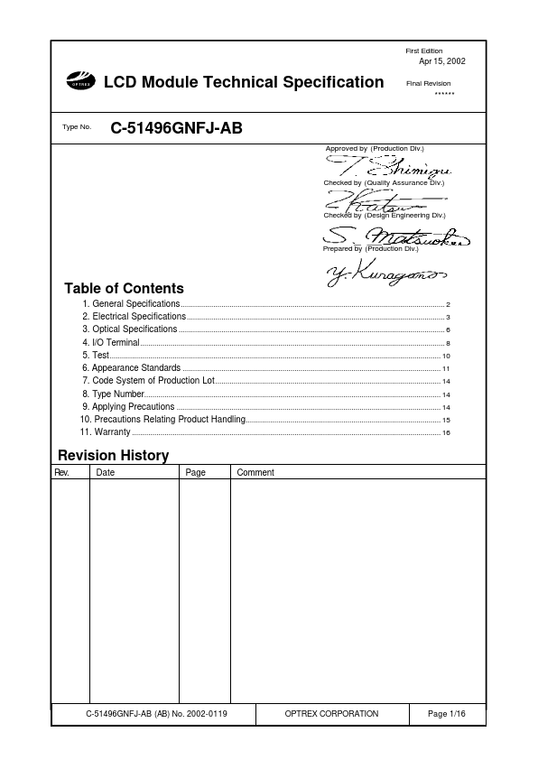 OPTREX LCD Module Technical Specification First Edition Apr 15, 2002 Final Revision Type No. C-51496GNFJ-AB Approved by (Production Div.) Checked by (Quality Assurance Div.) Checked by (Design Engineering Div.) Prepared by (Production Div.) Table of Contents 1. General Specifications..................................................................................................................................